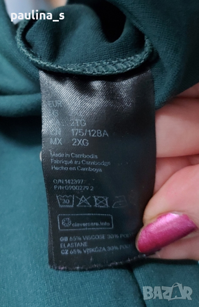 1. 2XL / 4XL - "H&M". Цената е крайна 44,99лв / 22,5 евро. Еластична брандова рокля тип туника с джобове, елегантно бие, ръкави 7/8, леко разкроен силует, в маслено зелено. Нова е, без дефекти и етикет, има еластичност и покрива няколко размера, посочени са, вижте мерките в обявата. Гигант размер е, една бройка.