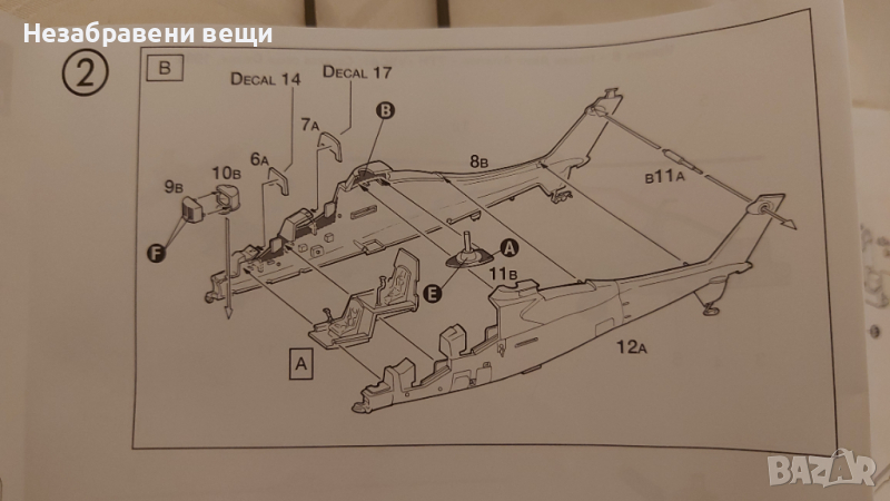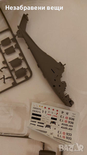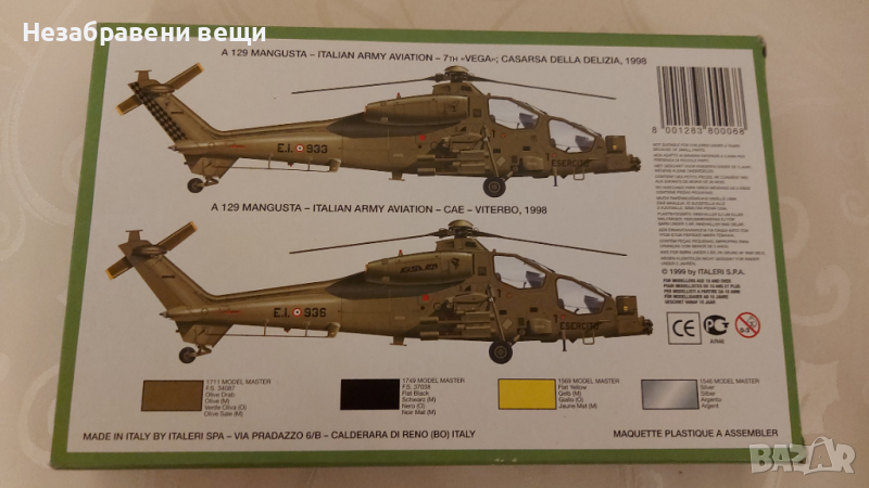 Модел на хеликоптер А-129 Mangusta Italeri от 1999 г, в мащаб 1:72, номер 006. Комплектът е съхраняван грижливо е и като нов, налични са всички части и лепенки, внимателно ги проверих по упътването, което също е налице. Моделът е започнат да бъде сглобяван, но само началото, до стъпка 2, ще го видите на снимките. За залепването му е използвано специално лепило на Revell, тубичката е запазена.