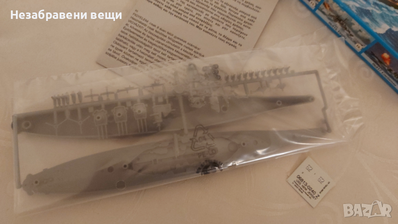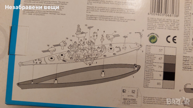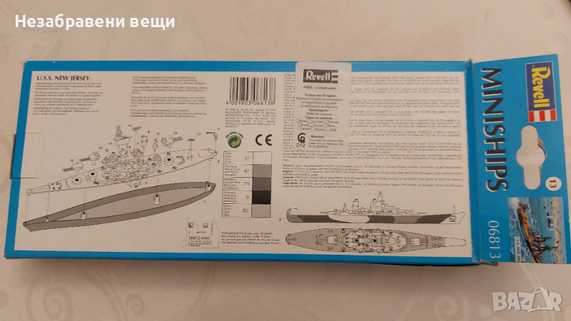Модел на мини кораб U.S.S. New Jersey в мащаб 1:1200 на Revell от 1998 г, номер 06813. Състояние като ново, макетът не е сглобяван, само кутията е отваряна, пластмасовата му опаковка е все още фабрично залепена, всичките му части са налице, както и лепенките. Инструкцията за сглобяване е на задната част на кутията. Комплектът не включва лепило и боя. Цена за този модел- 12 лева.