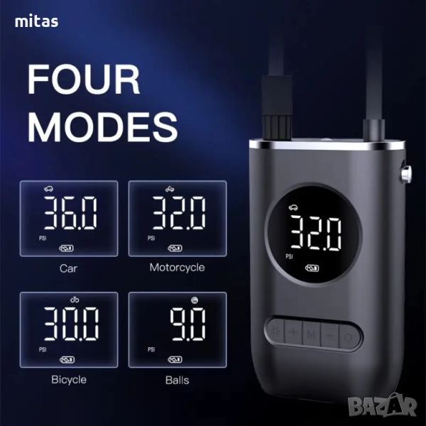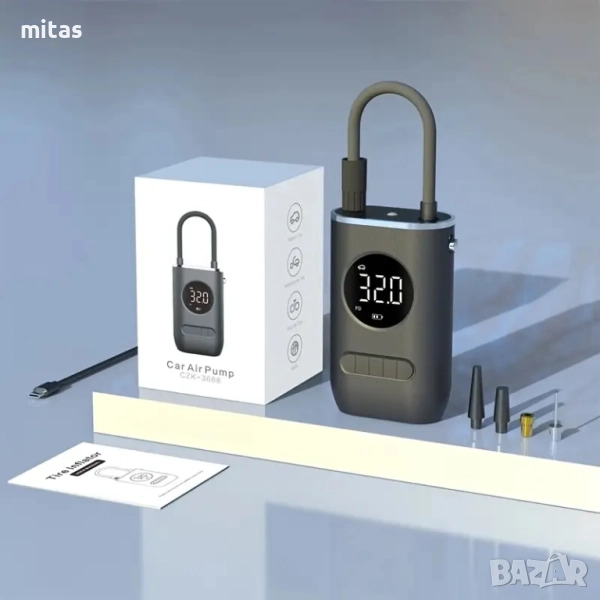 Компактният и мощен преносим компресор Type-C е създаден за бързо и прецизно напомпване на гуми на велосипеди, мотопеди, автомобили и спортни принадлежности. Благодарение на вградената батерия и автоматичния контрол на налягането, устройството осигурява надеждност и удобство във всяка ситуация.