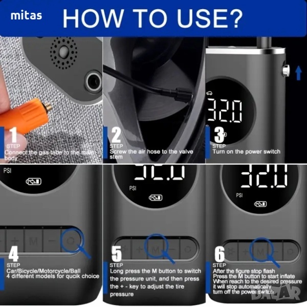 - Автоматично спиране при достигане на зададеното налягане – предотвратява презапълване и гарантира безопасност.
