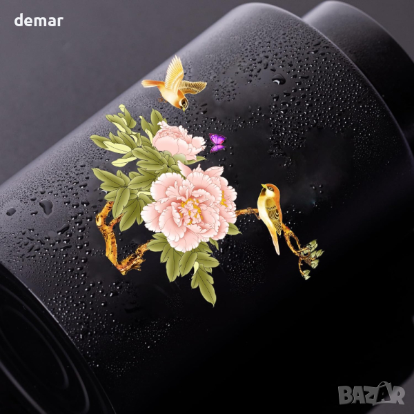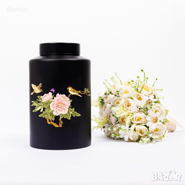 Мемориална урна за кремация. Черна урна с колибри, черна кадифена торба