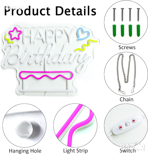 Неонов надпис "Честит рожден ден", създаден да внесе радост и жизненост във всяко празнуване на рожден ден. Изработен от прозрачен акрил и PVC гъвкави LED ленти, този знак гарантира безопасност и издръжливост. С предварително пробити дупки и верига за окачване е безпроблемно да се монтира на стена или да се постави на маса като нощна лампа. Захранван от USB, той предлага регулируема яркост и може да се използва с различни източници на захранване. 3D прозрачният дизайн подобрява стабилността и яркостта, създавайки незабравима атмосфера за рожден ден.
