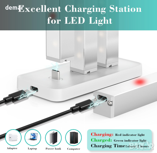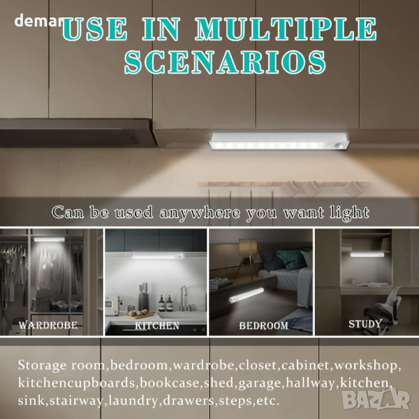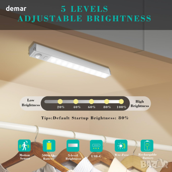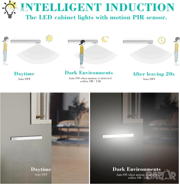 Кухненско осветление под шкаф със сензор, включващо 10 светодиода с пет регулируеми нива на яркост (20%-100%), осигуряващи персонализирано осветление за различни сценарии. Оборудван с възможности за засичане на движение и нощ, той се активира незабавно в обхват от 4 метра и ъгъл от 120°, като автоматично се изключва след 20 секунди бездействие. В допълнение, разполагате с 3-портова зарядна станция за трите лампи. Акумулаторната батерия, издържаща до 1-2 месеца в сензорен режим. Инсталирането е безпроблемно с вградени магнити или залепващи метални пластини, подходящи за различни приложения като спални, килери, работилници и извънредни ситуации на открито, осигурявайки удобни решения за осветление без необходимост от електрически контакти.