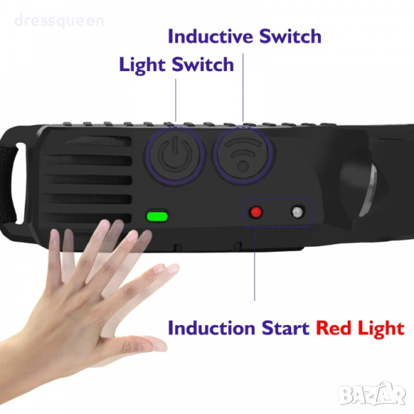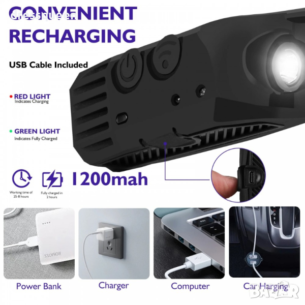 ✅ Допълнително челникът е оборудван с възможност за включване на сензор за движение (чрез бутон на корпуса), който включва и изключва фенерчето с жест на ръката. Тази опция ще бъде особено полезна, например когато работите върху кола или други машини. Тя ще ви позволи да включвате/изключвате източника на светлина, без да докосвате челникът с мръсни ръце.