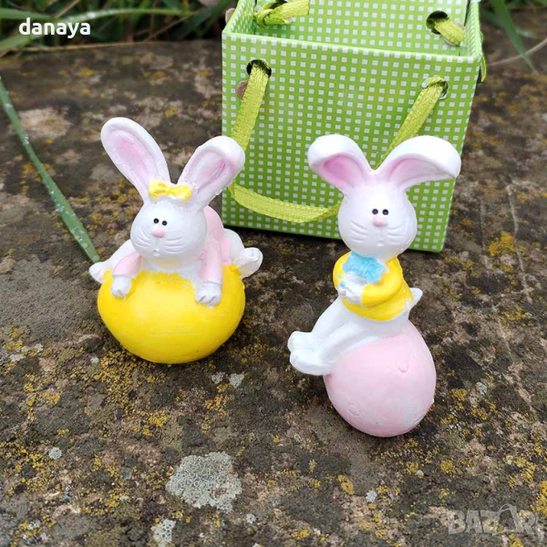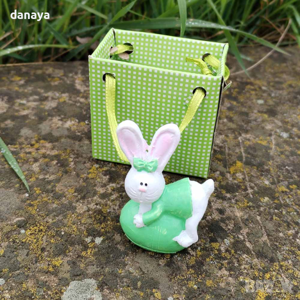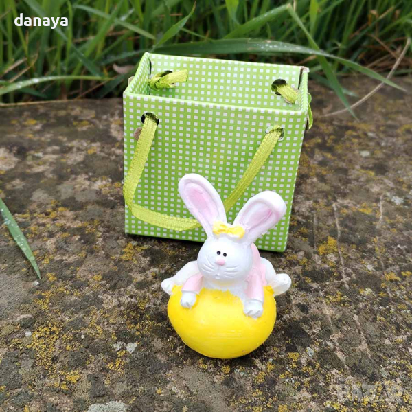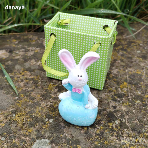 Малка декоративна фигурка – зайче с цветни дрехи, седнало върху великденско яйце, в подаръчна торбичка. Предлагат се различни модели. Много подходящи за великденски подарък на много хора.