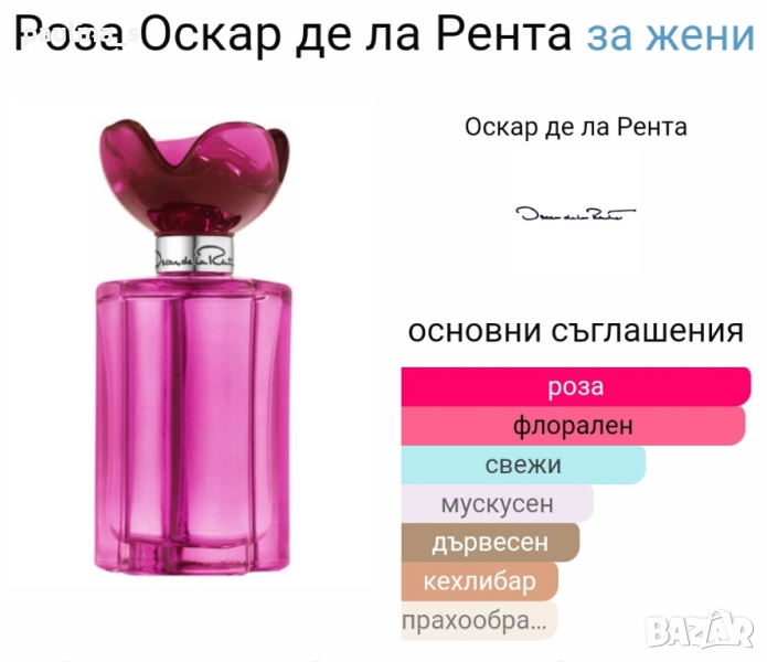 1️⃣. Дамски парфюм - "Rose" by Oscar de la Renta 100ml EDT. Цената е крайна, без пазарлъци 30 евро. Дамски дизайнерски парфюм с доказано качество, липсват 2 спрея за тест, нов, пълна презентация, продукт с кутия. Бач код - NF09, Made in USA. Информацията и ароматната пирамида са от Фрагрантика.