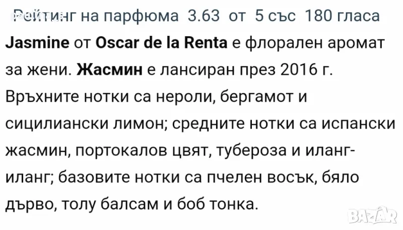 2️⃣ . Дамски парфюм - "Jasmine" by Oscar de la Renta / 100ml EDT. Made in USA, бач код NH24. Цената е крайна 32 евро. Дизайнерски парфюм, купен е преди 3г от Елинор, дадох му достатъчно време, усещам го на дреха до другия ден чак, мноого ми е "силен". Липсват 2 фъса за проба. Информацията и ароматната пирамида са от Фрагрантика.