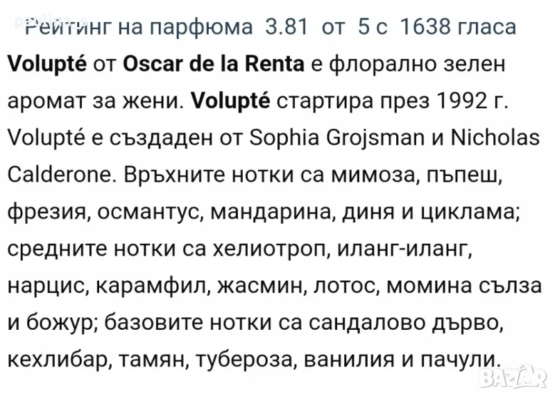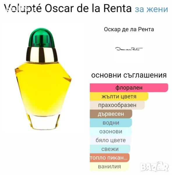 3️⃣. Дамски дизайнерски парфюми "Volupte" by Oscar de la Renta 100ml EDT. Made in USA, бач код NE10. Цената е крайна 35 евро. Дамски дизайнерски парфюм с доказано качество, old school стил парфюм на София Гройсман, пълна презентация, продукт с кутия. Информацията и ароматната пирамида са от Фрагрантика. Липсват 2 фъса за проба, пълна презентация. Мирише на старото Воларе на Орифлейм.