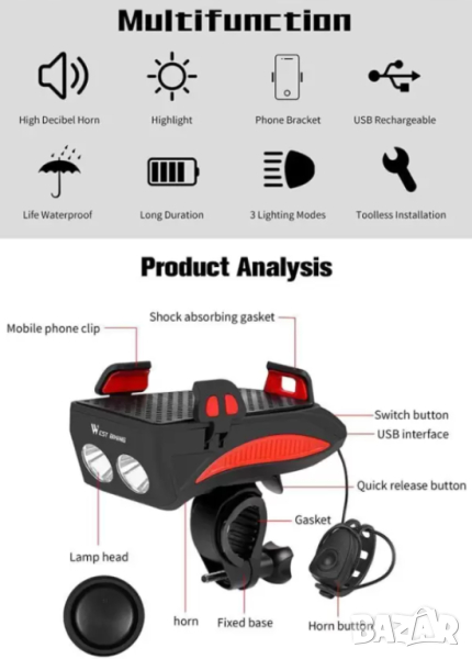 Съчетава едновременно LED светлина за велосипед, стойка за телефон, регулируем