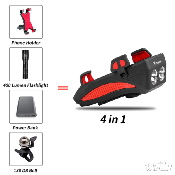 Преден фар за велосипед (4 в 1) 550Lm, 2000mAh.