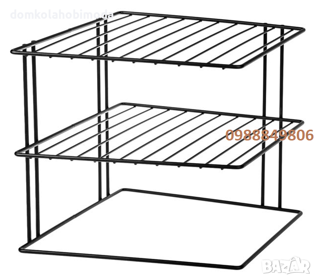 -Описание - Характеристики Триетажна ъглова етажерка за съдове, в черен цвят. Поставя се на кухненския рафт, шкаф или плот за съдове, няма нужда да подреждате един размер в друг. Рафтовете са с разстояние от 9,5 см помежду си и могат да поберат много неща, дълбоки чинии и чинии с плодове. Организирайте пространството си лесно, практично и стилно! Цвят черен Материал на продукта Метал Дължина x Ширина x Височина 23х23х21 см