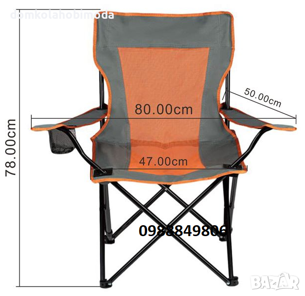 стол за къмпинг със здрава рамка с 0,8 mm пръти, 80 cm размах на ръцете и издръжлива оксфордска тъкан 600 D с PE покритие. Има поставка за чаша на дясната дръжка и перфорирана част в средата на седалката. Сгъва се за лесно съхранение и има чанта за носене.