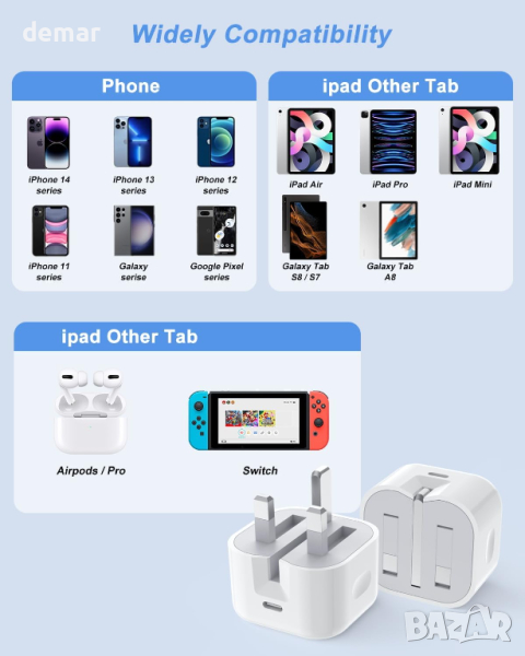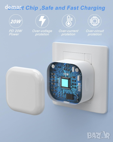 20W USB C бързо зарядно устройство използва PD 3.0 технология, зареждайки iPhone до 50% само за 25 минути – утрояване на скоростта на 5W зарядно устройство, спестявайки значително време. Въпреки че изисква допълнителен USB C кабел (не е включен), неговата съвместимост се простира в гамата на iPhone, включително iPhone 15/14/14 Pro Max и по-ранни модели, iPad, AirPods Pro, серия Samsung Galaxy S20, серия Huawei P40 и др. Проектиран за преносимост, тънкият му профил го прави идеален за пътуване. Той включва множество функции за безопасност за защита срещу често срещани електрически проблеми. Пакетът включва две зарядни устройства.