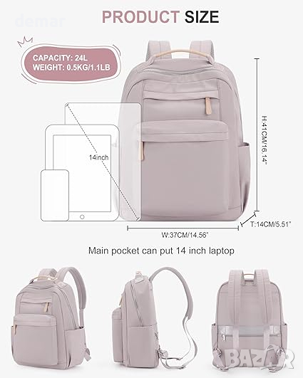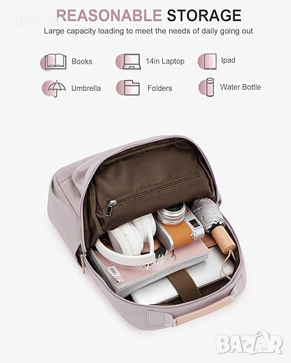 BOXSAM Дамска раница за лаптоп 14 инча, ученическа, туристическа,водоустойчива, лилаво