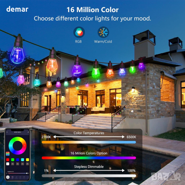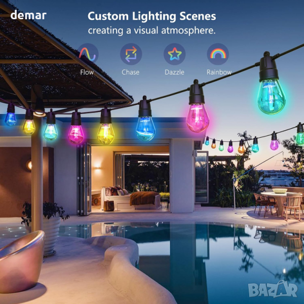 Тези RGB външни светлини предлагат 16 милиона цветови опции за персонализирана атмосфера, с персонализирани модели като избледняване, скачане, автоматично или светкавица и регулируема скорост на промяна на цвета. С интелигентно приложение и гласово управление можете да зададете яркостта от 0%-100%, да изберете сценични режими и да планирате таймери за включване/изключване, подобрявайки удобството и настроението. Те са водоустойчиви (IP65) и нечупливи, което ги прави издръжливи за целогодишна употреба на открито, въпреки че захранващият адаптер трябва да се поддържа сух. Синхронизирайте светлините с музика за динамични звуково-светлинни шоута по време на Коледа, Хелоуин или друг празник.