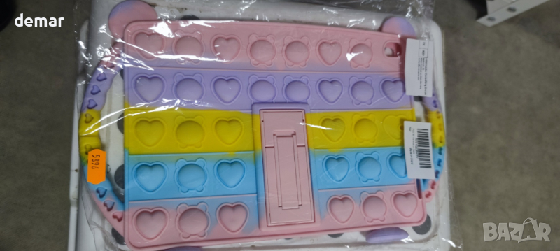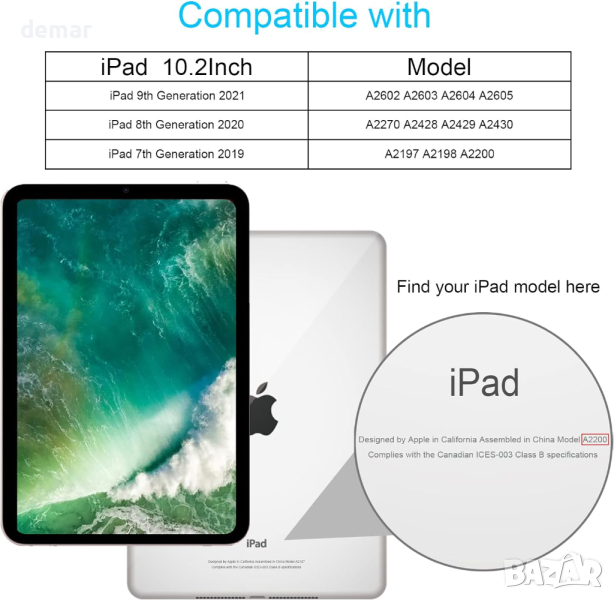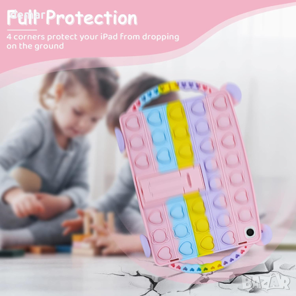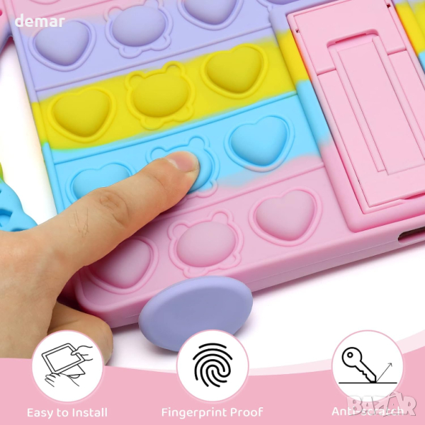 Този калъф за iPad е предназначен за 9-то поколение 10,2 инча 2021 г. (модели: A2602/A2603/A2604/A2605), 8-мо поколение 10,2 инча 2020 г. (модели: A2270/A2428/A2429/A2430) и 7-мо поколение 10,2 инча 2019 г. (модели : A2197/A2198/A2200). Разполага със стойка и дръжки за универсално използване при гледане, работа, писане или рисуване. Изработен от течен силикон, той е издръжлив, нетоксичен, лесен за почистване и безопасен за всички възрасти. Дизайнът на калъфа за облекчаване на напрежението с контрастни цветове и мехурче с играчка за пръсти осигурява уникален, привличащ вниманието външен вид и успокояващо изживяване при допир. Той предлага идеално прилягане с прецизни изрези за всички функции, осигуряващи пълна защита и лесно инсталиране/демонтиране, без необходимост от премахване на кутията за зареждане.