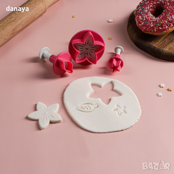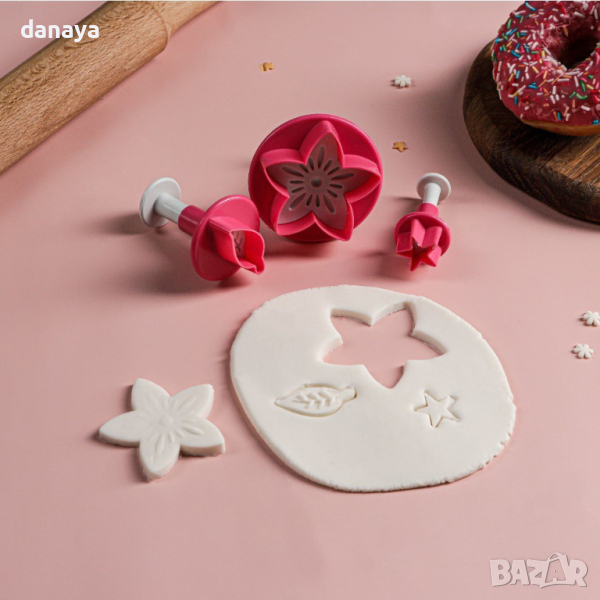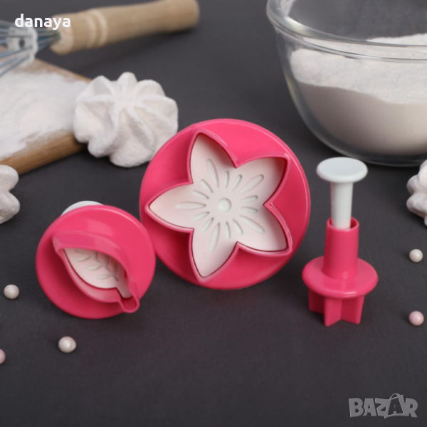 Комплект от 3 броя форми за сладки с релеф Нарциз, звездичка и листенце, като всяка формичка е с различен размер. Подходящи са за оформяне на сладки, соленки, курабии и бисквити. Чудесни са и за декорация на торти. Резците са с релеф и бутало, за лесно освобождаване на тестото.
