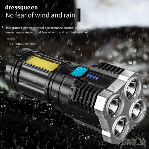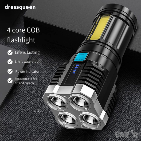Мощен LED фенер със светлинен поток 1000Lm. Яркото осветление на фенера се осигурява от основните светодиоди 4xT6, а има и допълнителен диод 1xCSOV.