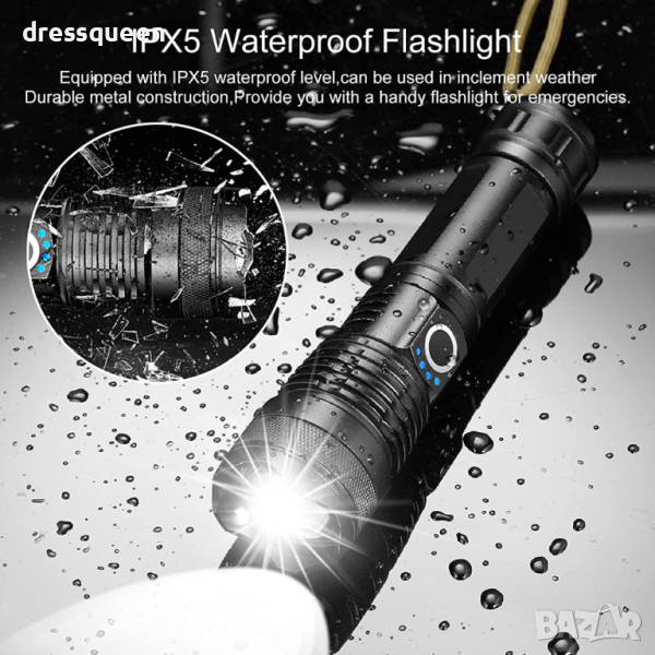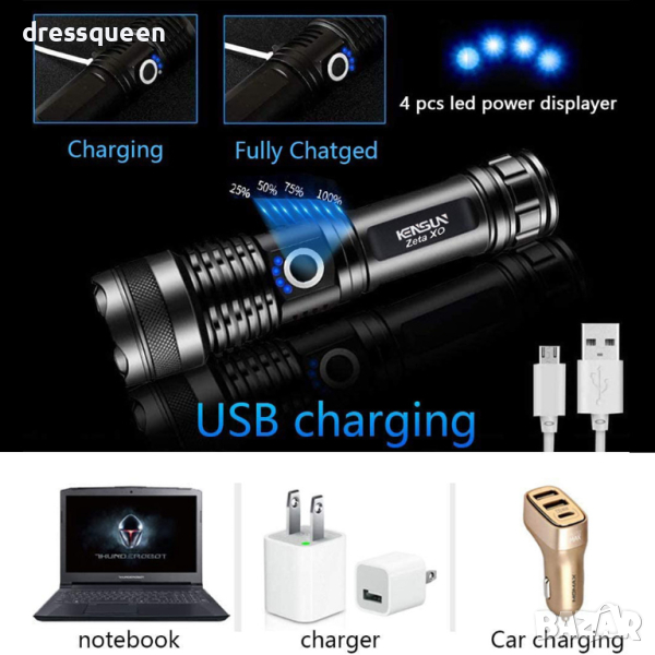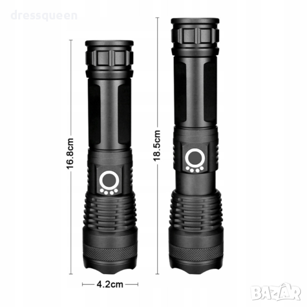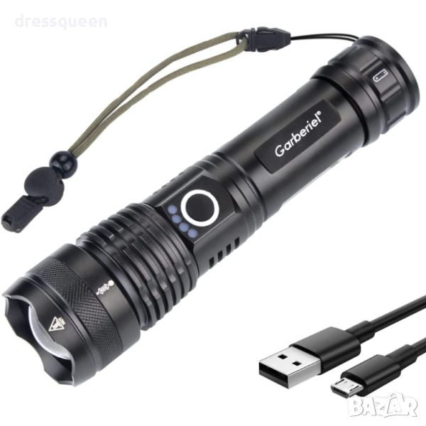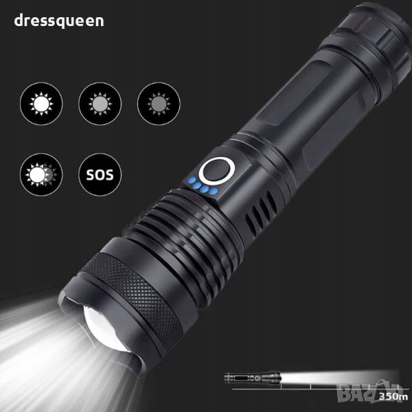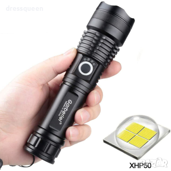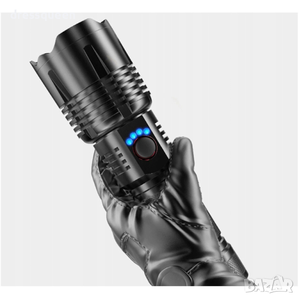 Мощен LED презареждащ се фенер с много здраво тяло от алуминиева сплав и дизайн против приплъзване. Дисплей за капацитета на батерията, телескопично увеличение. Обхват до 500 метра и водоустойчивост! Презареждащи се батерии! 180 лумина светлинен поток!