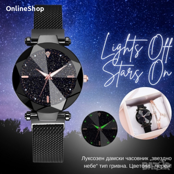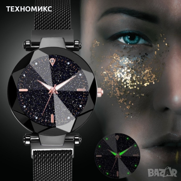 Уникалният модел дамски магнитен часовник ще се превърне във ваш любим аксесоар за всеки повод. Предлага се в различни цветове, за да улесним вашия избор и да бъдете неотразима всеки ден, с всеки ваш тоалет. Циферблата е черен, осеян със златисти и сребърни „звезди“, истинско звездно небе. Стрелките и основните отбелязвания на 12, 3,6 и 9 са фино изработени от розово злато. Малките сребристи камъчета, отбелязващи останалите часове, както вътрешността на стрелките светят в електриково зелено, когато е тъмно. Така вие винаги ще знаете колко е часа, дори в непрогледна нощ.