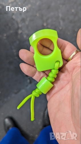 На снимките се вижда достатъчно добре какво представлява, ключодържател от флуоресциращ материал, не се хваща от метал детектори, формата е удобна са надяване на пръст. Използва се по усмотрение на човека, имам два цвята - син и зелен.