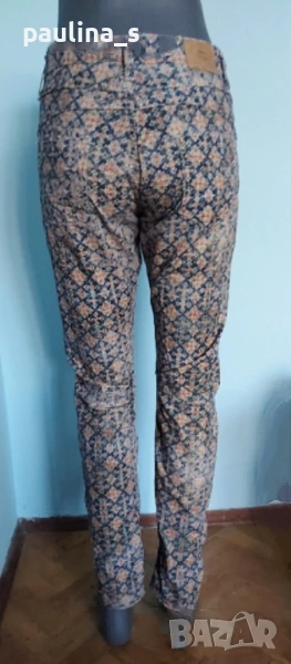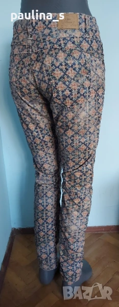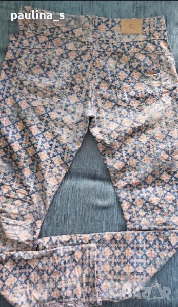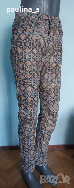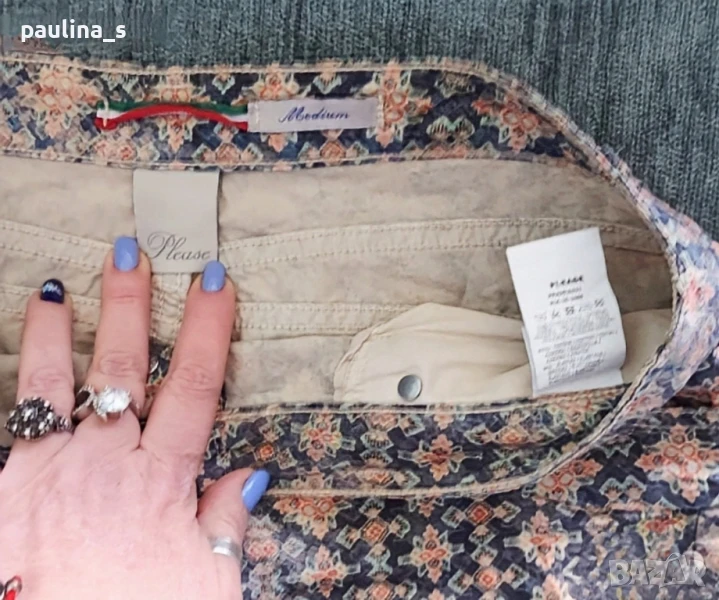 2️⃣. M / XL - "Please" jeans. Цената е крайна 29,99лв / 15 евро. Винтидж / Рядка находка! Брандови еластични дънкови панталони с флорален принт, брандирани, кожена емблема, избелващ ефект. Платът е тънък и еластичен, моделът се вижда добре, с леко ниска талия и външни брандирани копчета. Една бройка е, без дефекти, става за посочените размери. Талия 42см до 44см едностранно / 82см до 88см Ханш 51см до 59см едностранно