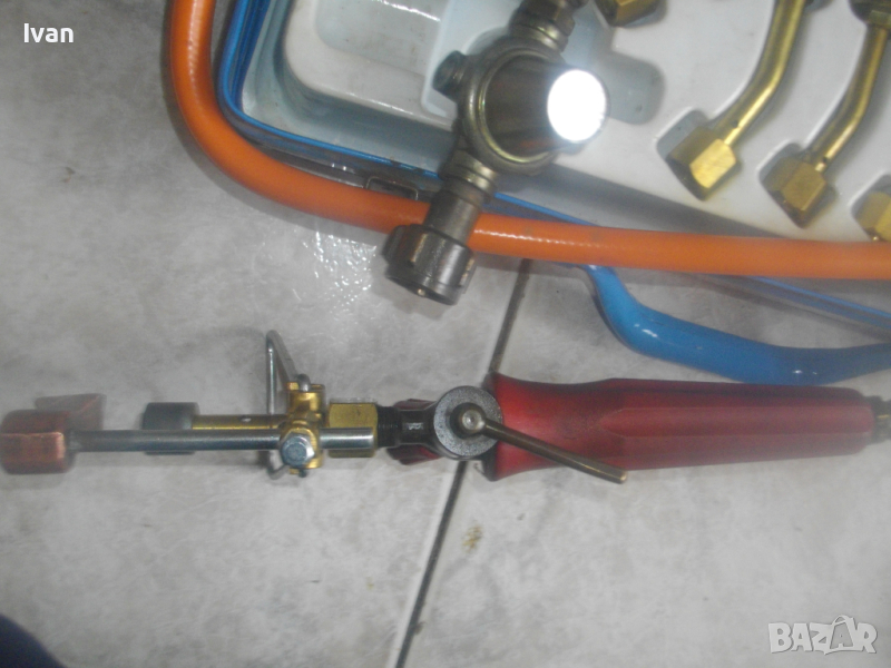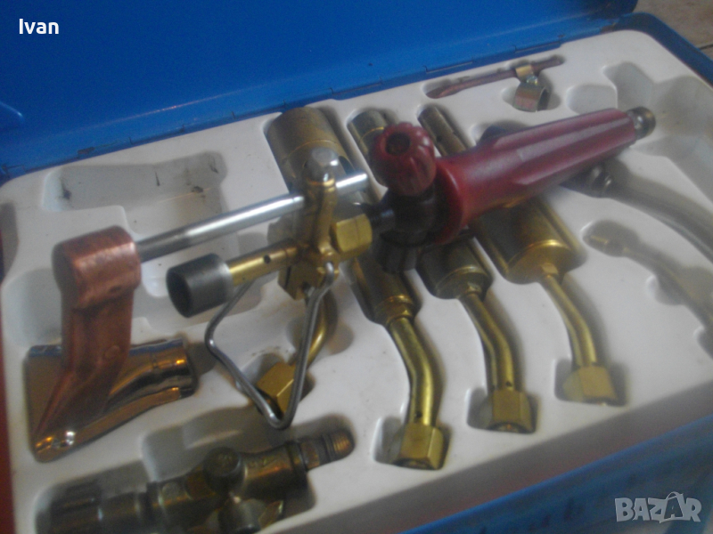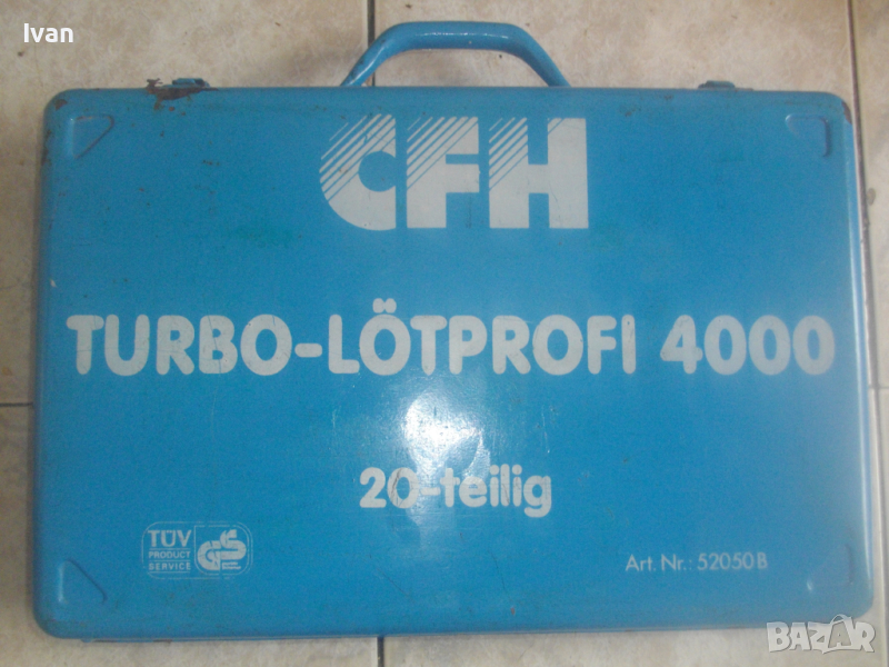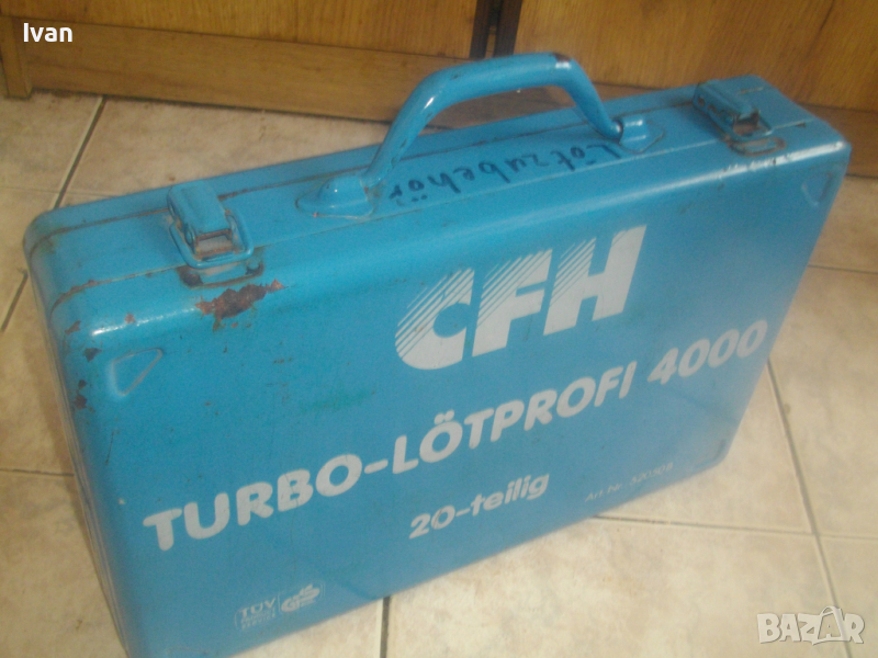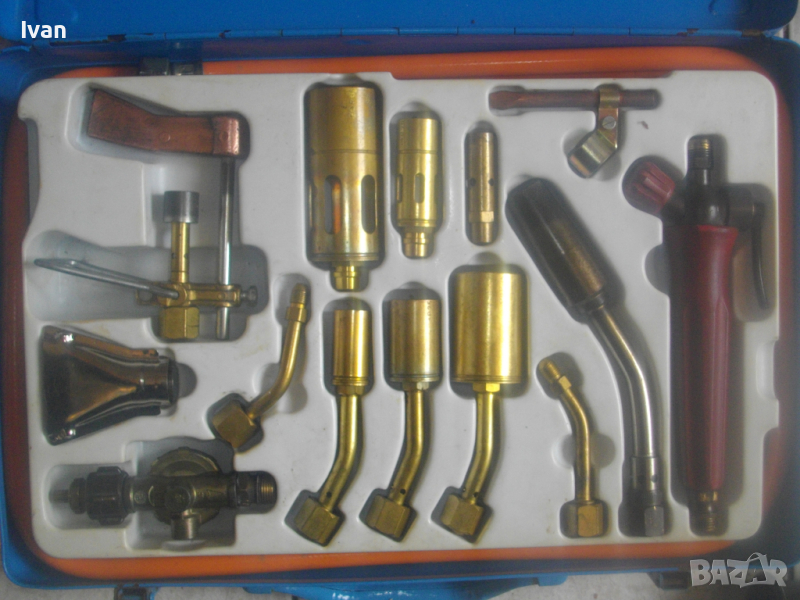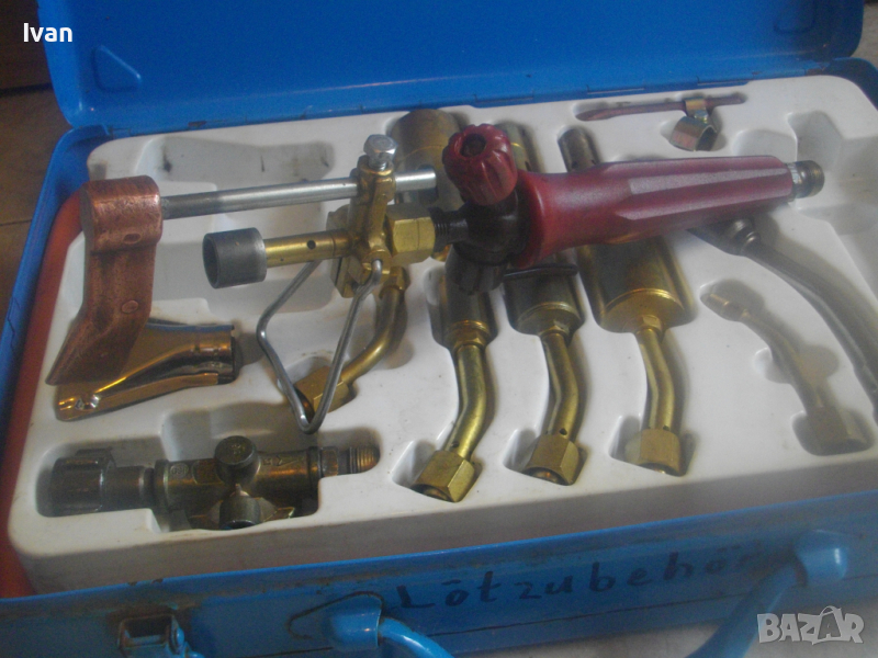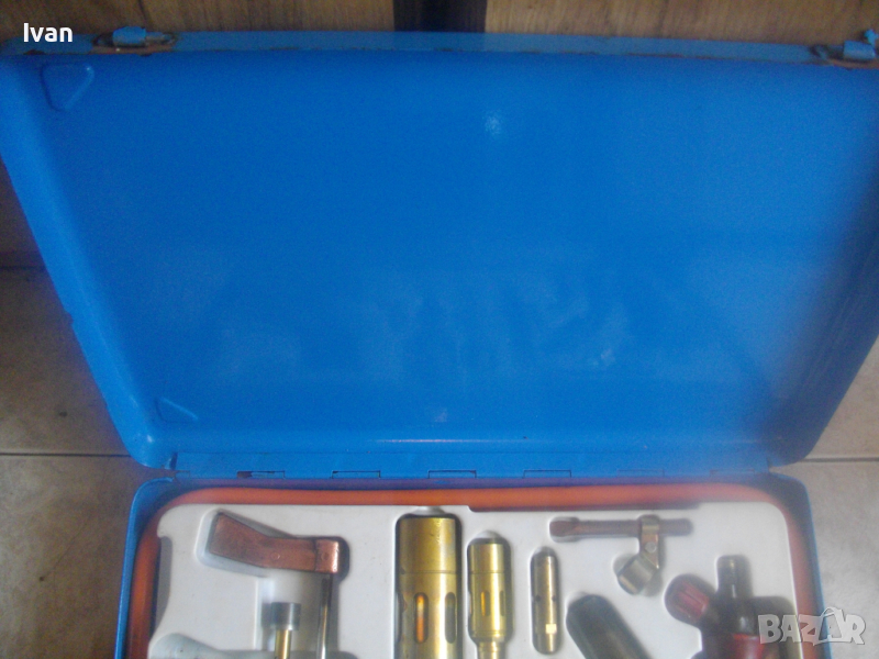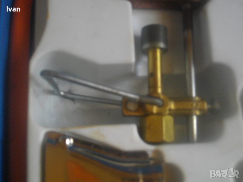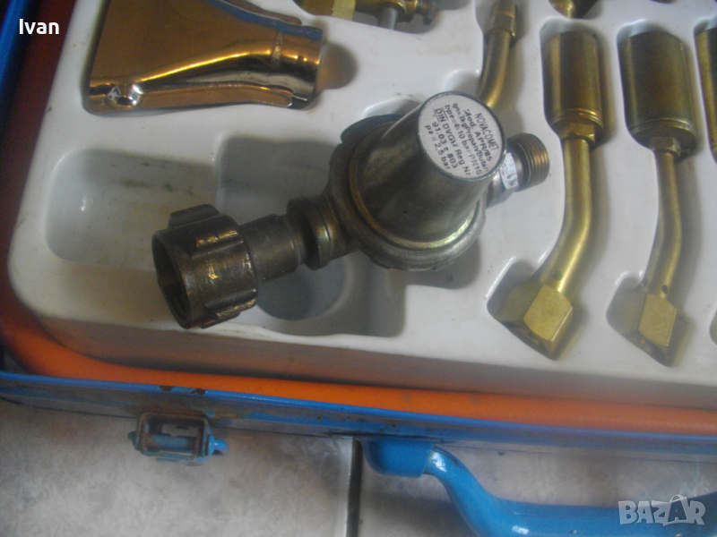 ОПИСАНИЕ на газов пропан бутан комплект в син куфар горелки и поялници с маркуч и вентил. Цена 399 лв. (204.01 €). Старо масивно качество. Италински оригинален с маркирано италианското производство - Made in ITALY. Марка и модел /маркировки - CFH TURBO Lot Profi 4000 - 20 feilig TUV. Отлично състояние. Общо висчко 20 части: блендер дръжка с бронзов спусък и спирателен кран, 9 бр. рамена различни с различни контактни горелки дюзи отпред, прииставка тънък пояленк меден, приставка голям поялник меден с дължина 90 мм, метална дюза за топъл въздух обдухване, редуцир вентил оригинален с маркировка Made in ITALY и бронзови щуцери, с характеристики 4-10 bar, Pa - 2,5 bar.Всички дююзи, рамена и горелки са от дебел плътен масивен бронз. Маркуч нов с дължина 2,5 м. ф 11 мм и гайки М16 за скачване с горелката и веентила. Вложка ПВЦ бяла в куфара с вградени места на компонентите. Всички компоненти са маркирани с бранда марката и с номера на модела за проверка на оригиналност на каталога на марката. Куфар - голям, масивен, метален изцяло, с метални копчалки и вградена метална дръжка. Печат за Тюв сертификат качество -TUV Product Service. Цялостно тегло на всичко /цлия комплект с куфара / - 5,5 кг. Цена на комплекта - 399 лв.(204.01 €)