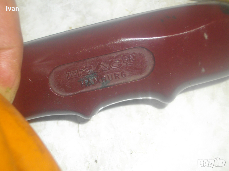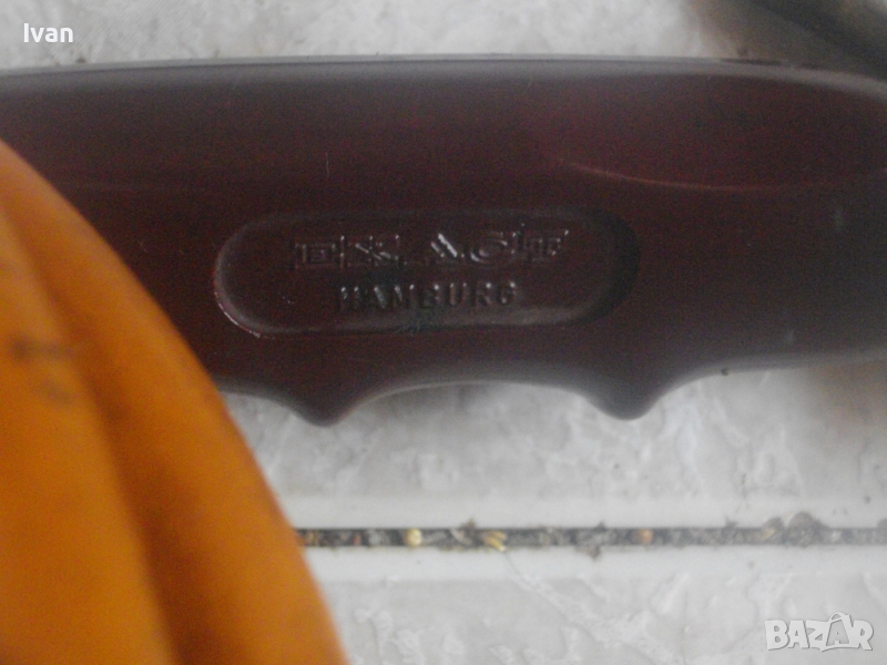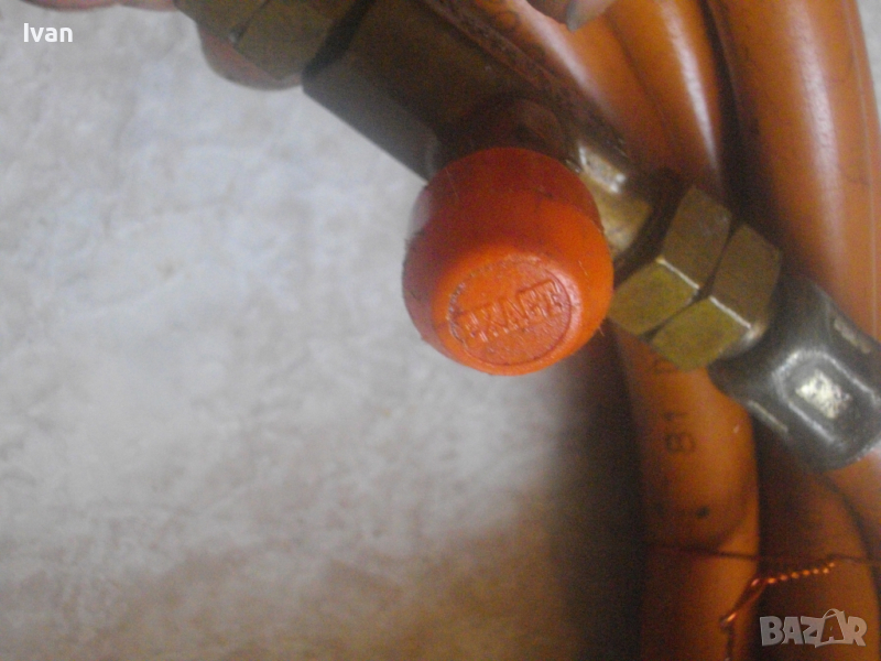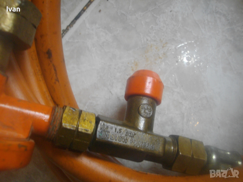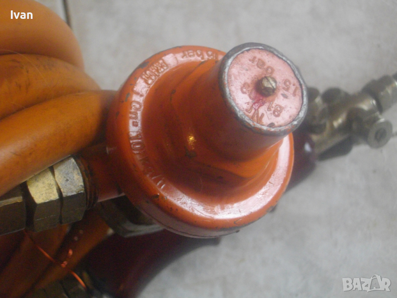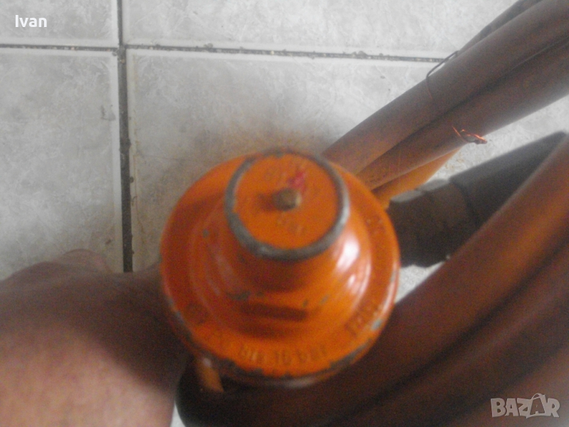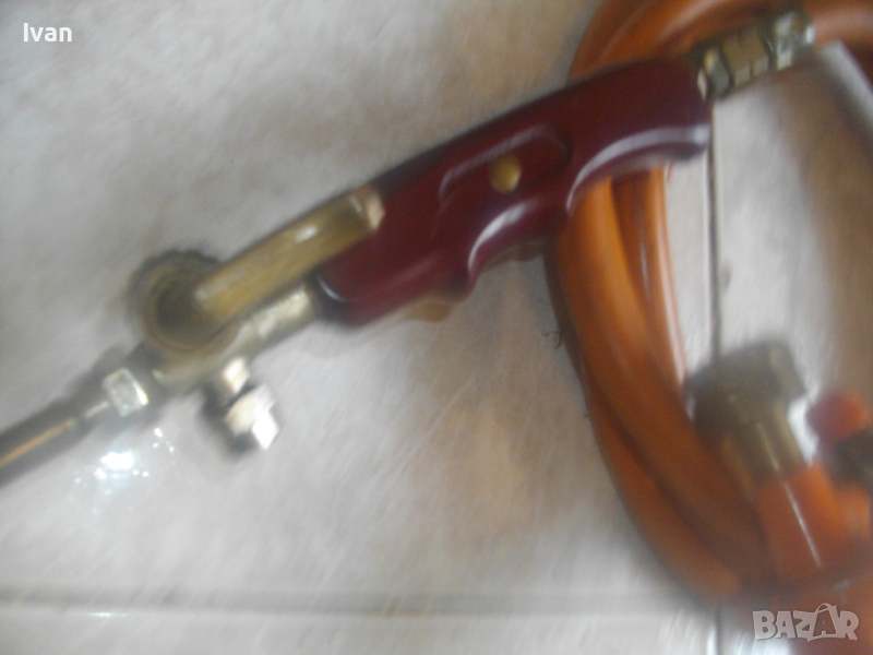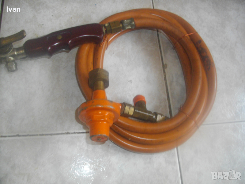 ОПИСАНИЕ на 510 мм газова пропан-бутан горелка с маркуч и редуцир вентил за ремонтни дейности, хидроизолации, покриви и други. Цена 199 лв. Марка EXACT HAMBURG . Пълен комплект с оригинален маркуч ф 11 мм и с ориггинален на бранда марката редуцир вентил. Запазен външен вид и отлично работно състояние. Старо немско професионално качество. Дължина на горелката - 510 мм. Бакелитова дръжка на ръкохватката с маркировка на бранда. Спусък бронзов. Дюза отпред ф 50 мм, масивна, от дебел бронз. Маркуч оригинален скачен - 2,5 м. ф 11 мм, DIN DVGW. Редуцир вентил регулатор налягане оригинален скачен - масивен - голям - алуминиев - с бронзови щуцери - TTyp 240 - 6,0 kg/h. Вентила е с маркировка на бранда. Спирателен кран на вентила Тегло на всичко - 2,5 кг. Цена - 199 лв.