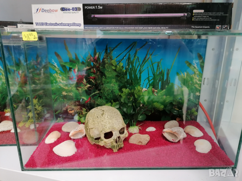 Продавам нов направен украсен аквариум 17л. ш.18.д.39.в.24см.Има горен стъклен подвижен капак, розов грунд, задно фолио. Цена32лв. При желание артикула череп струва 15лв. лампа 14лв.термометър 2.50лв.Имам и други артикули и размери аквариуми.Вътрешни и външни помпи, нагреватели, кепчета, различни цветове пясък. Приемам поръчки за аквариуми с 50 % капаро. Качествена изработка на аквариуми. Предлагам различни видове риба. Живоротки, хайверни, цихлиди от Малави. GSM 0887219593