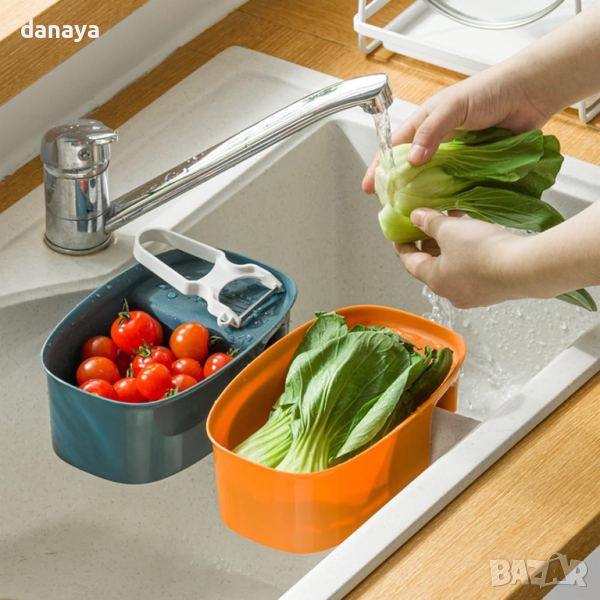 Закачащ се органайзер за кухненска мивка, който може да се използва и като цедка и гевгир за измиване и отцеждане на плодове и зеленчуци.
