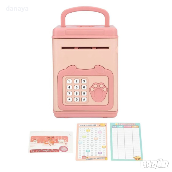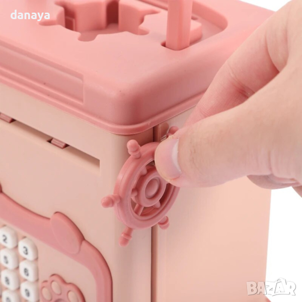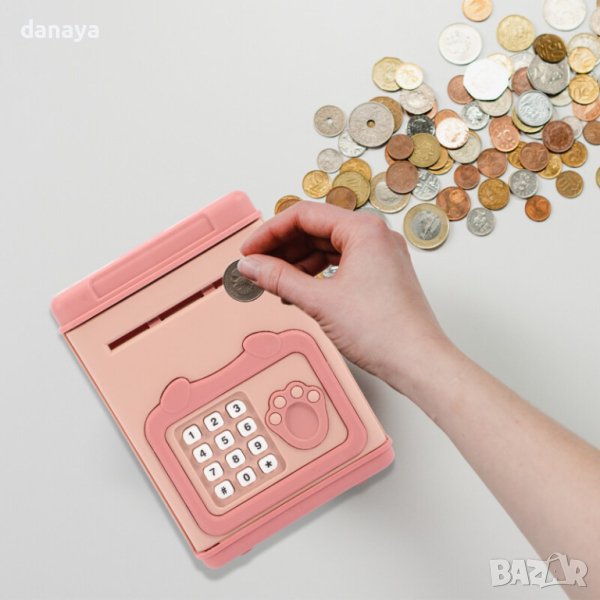 Детска касичка сейф с код, пръстов отпечатък и звуци. Детският сейф с шифър е много атрактивна алтернатива на традиционната касичка. Можете да поставите както банкноти, така и монети в него и да ги премахнете, ако е необходимо, след като въведете съответния код и поставите пръст в определеното място. Сейфът е много добра идея да научите как да спестявате собствените си пари и да планирате разходите си. Банкоматът е подсигурен със специален четирицифрен код. За да можете да се възползвате от спестяванията, натрупани в сейфа, трябва да въведете правилния ПИН, след което да се индетифицирате с пръстов отпечатък. Едва тогава сейфът ще се отвори. Можете сами да зададете номера.