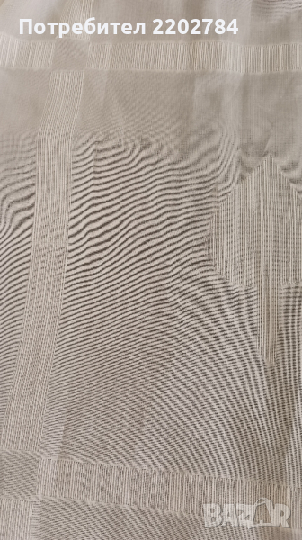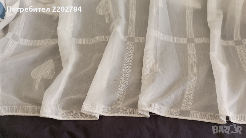 Трето е комплект от два броя тънки пердета.Интересното при тях е,че в долната част са прихванати успоредно на гънките на перделика с пластмасови тънки лентички като тези на етикетите.За да се запазят гънките на пердето при окачването.Няма никакъв проблем да се махнат с ножицата,ако не са нужни.Има и тежест в подгъва на пердето за по добро падане.В долната част над подгъва има леко надърпване на няколко места,което е незабележимо при поставянето на пердето( на последната снимка)