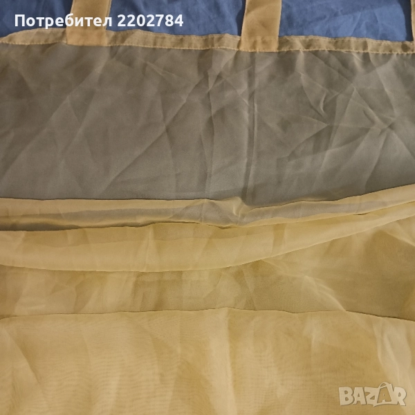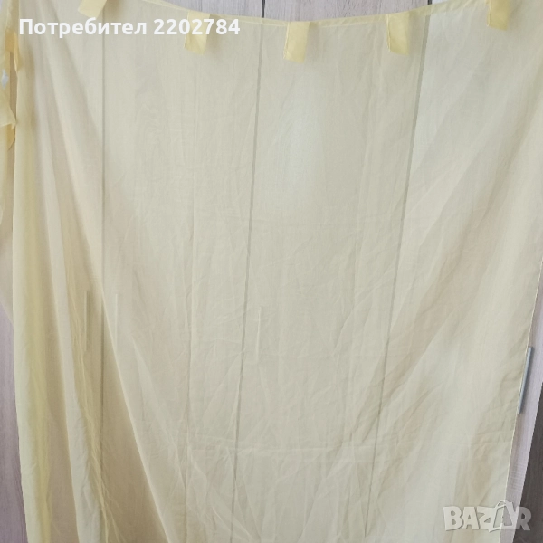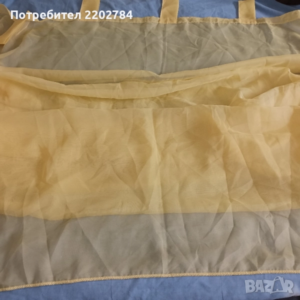 Последен е комплект от два броя светложълти прозрачни пердета от тънка органза с ,,уши" за нанизване на тръбен корниз.Размер на едното - ширина 170см, дължина 240см.Без забележки.