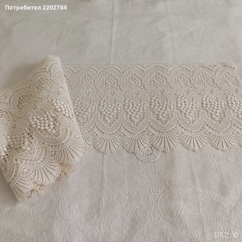 На последните две снимки е ново перде за долната част на прозореца.Пердето е цяло парче с ширина 5 метра и 20см и дължина 35см.Много красиво със силно релефни гроздове.Цвят екрю.Без забележки.