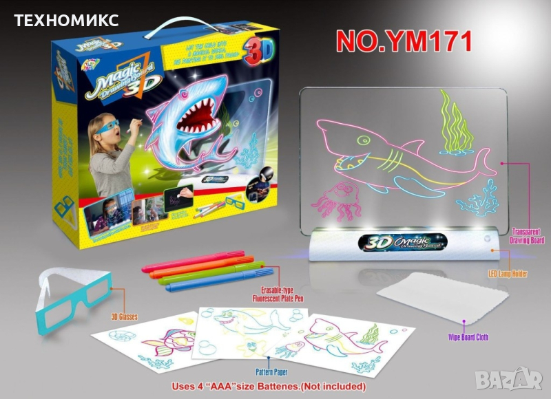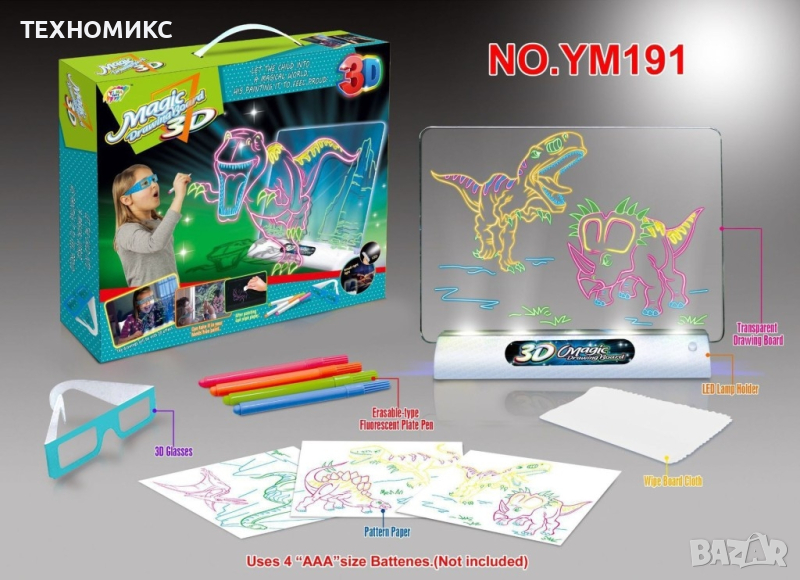 Прозрачната дъска за рисуване се изтрива и може да се използва неограничен брой пъти. Специалната 3D светеща поставка работи с 4бр. батерии x 1.5V с размер AAA.