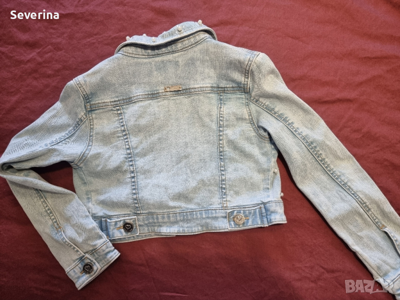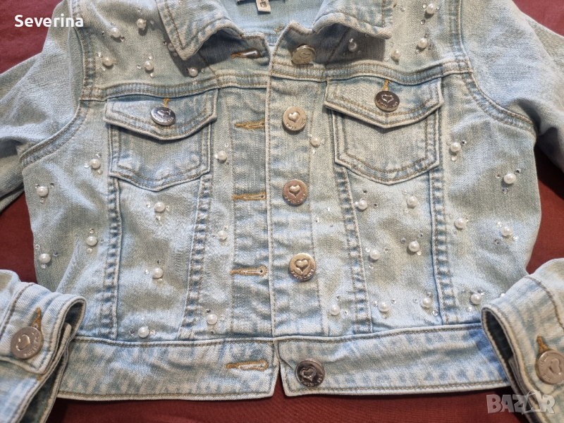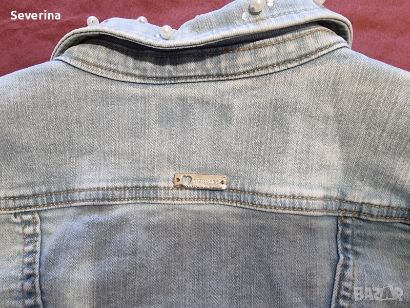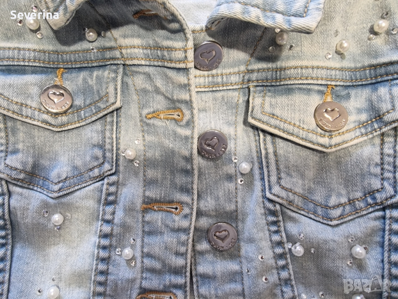 Пиша използвано състояние, но якето е обличано два пъти, за съжаление ни е малко. Страхотен модел, с перли и камъчета навсякъде отпред, с надпис на бранда по всички копчета и плочка с надпис на гърба.
