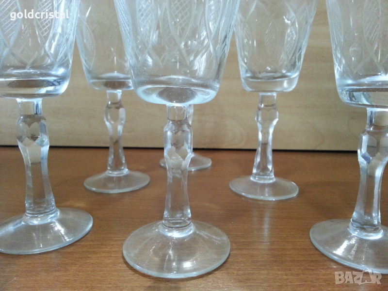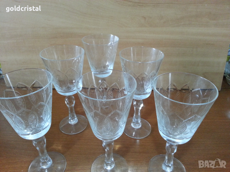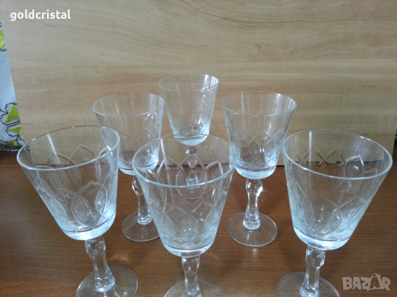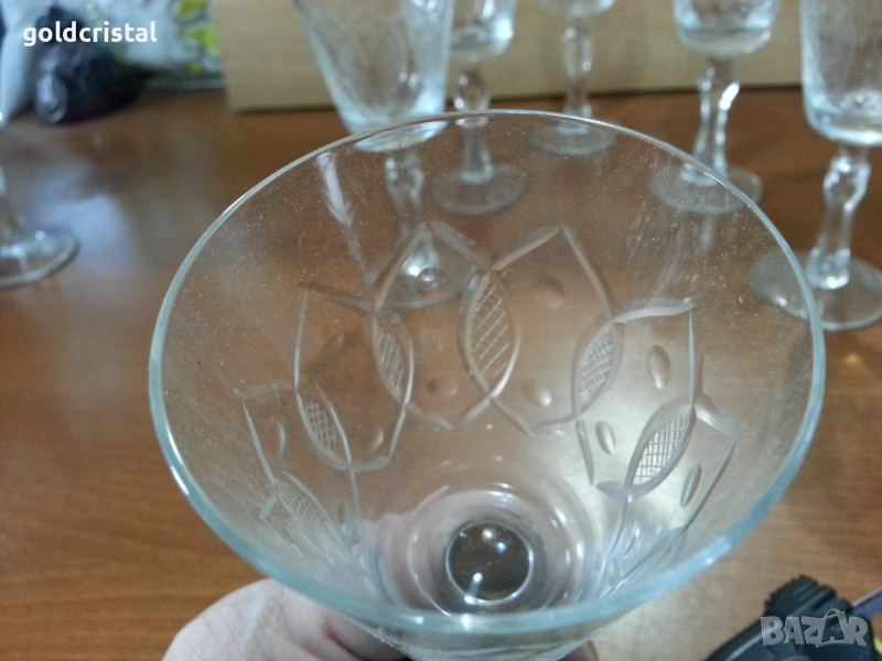 Ретро стъклени чаши за вино 6 бр-85лв за вода 6 бр-85лв гарафа 55лв гравирани неизползвани сервиз комплект сет лот ретро арт декор винтидж колекция стари антикварни предмети обзавеждане за дома и семейството подходящи за подарък за ценители и колекционери