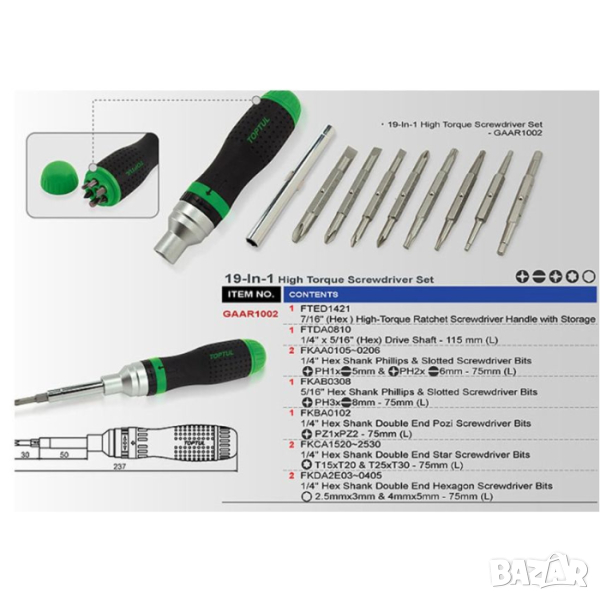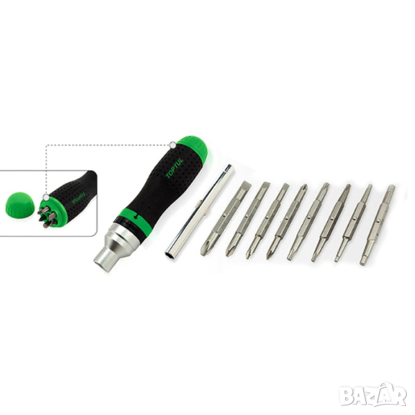 Дръжката е изработена от неприплъзващ материал и побира до 6 накрайника.