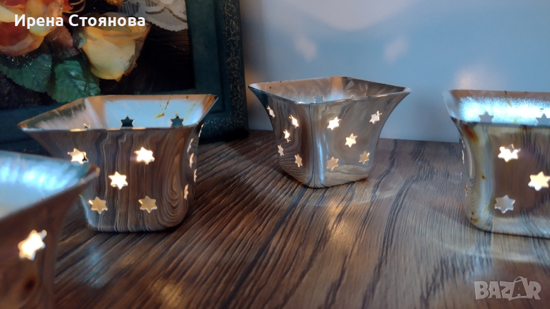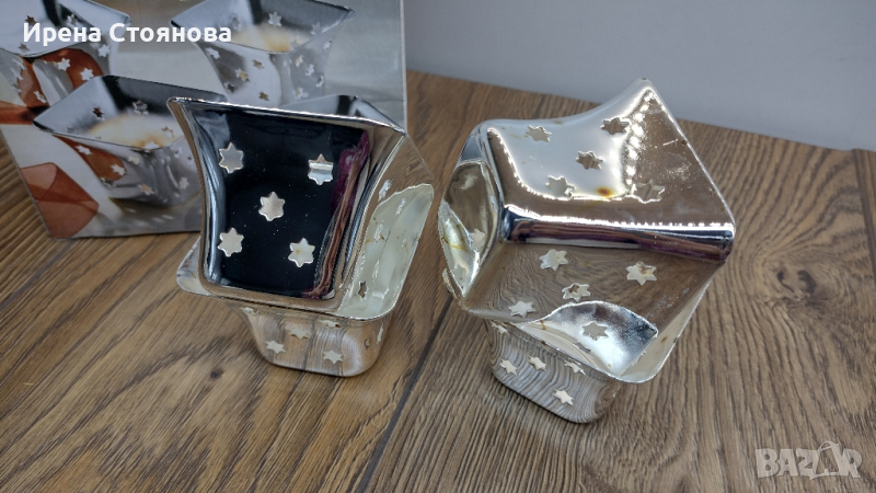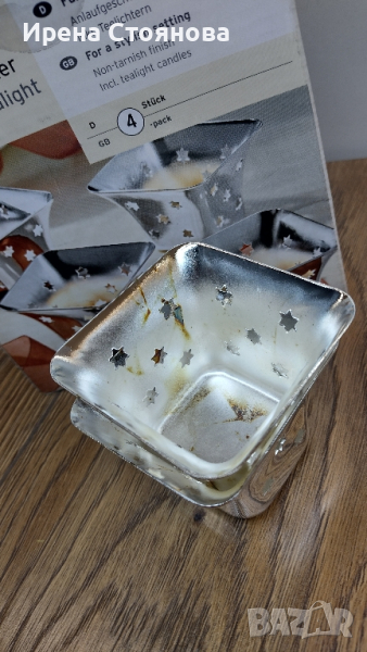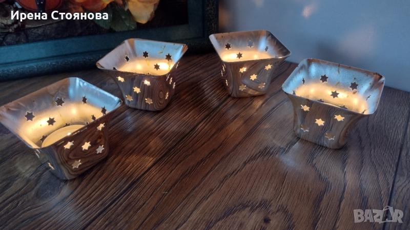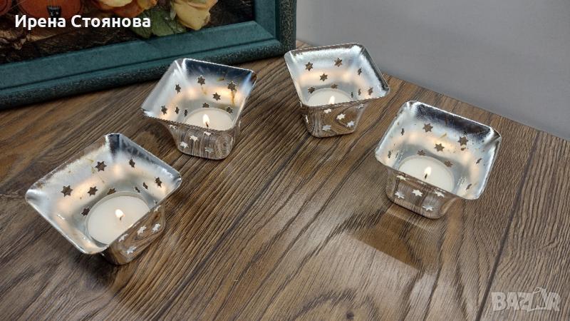 Посребрени свещници с чаени свещи, звезден мотив. Нови в оригинална опаковка, наличие на патина на места. 4 броя в опаковка. Налични 2 комплекта. Цена за комплект 35 лв.