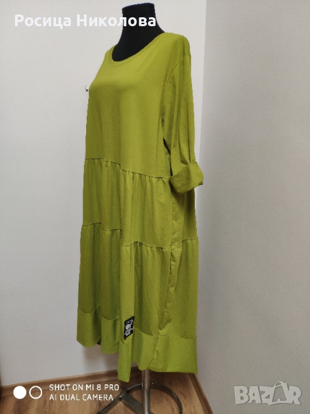 Рокля от памук и еластан с размери-дълж предница 110см, гръб 122см, гр об 114см и се разпъва до 128см,ханш до 160см, ръкав 50см.