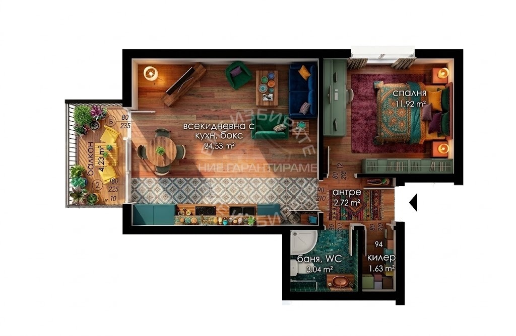 👉Разпределение: входно антре, дневна с кухненска част, спалня, тераса, баня с тоалет и килер. Жилището се издава със степен на завършеност по БДС.