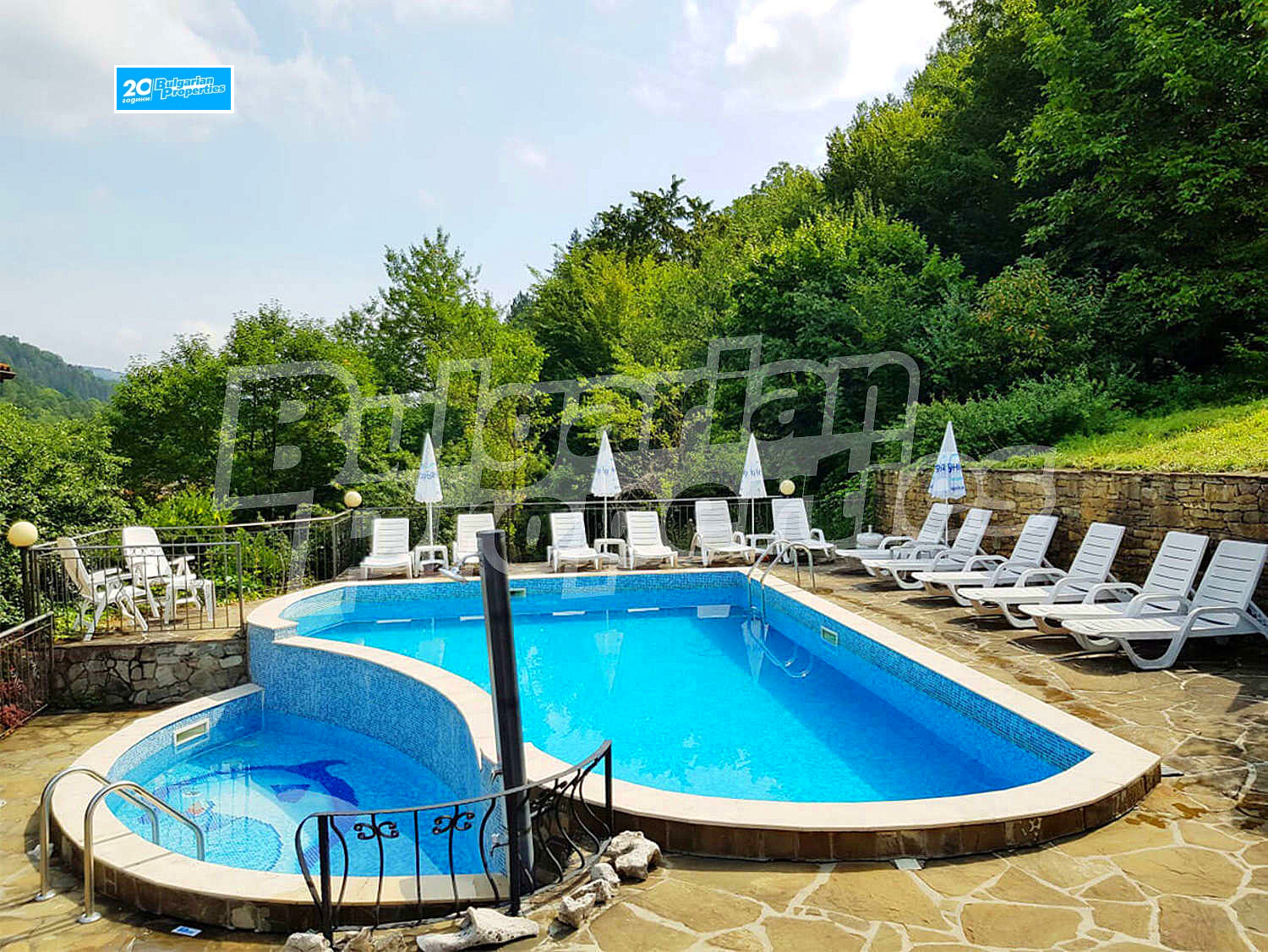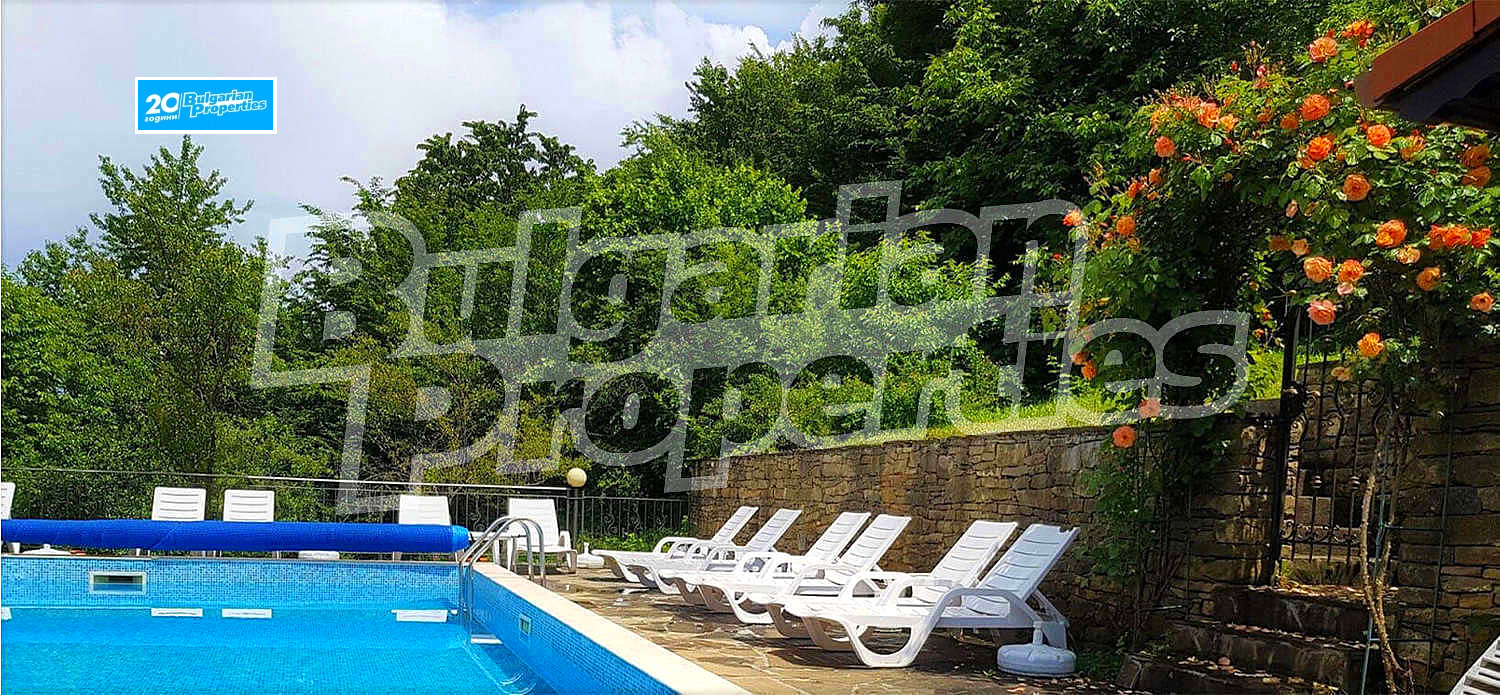 Новопостроената сграда е с РЗП 667 кв.м. функционално разпределени между двата етажа на хотела. Имотът е разположен в добре поддържан двор от 1000 кв.м. в централната част на населеното място и в същото време граничи с гората. В парцелът има изградени още открит голям и детски басейн, барбекю, цветна градина, зеленина и градинско осветление. Хотелът е построен и напълно оборудван с висок клас материали и уреди. Стилно и уютно е обзаведен само с мебели от естествени материали, което придава на имота още повече чар.