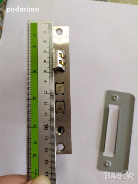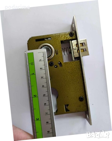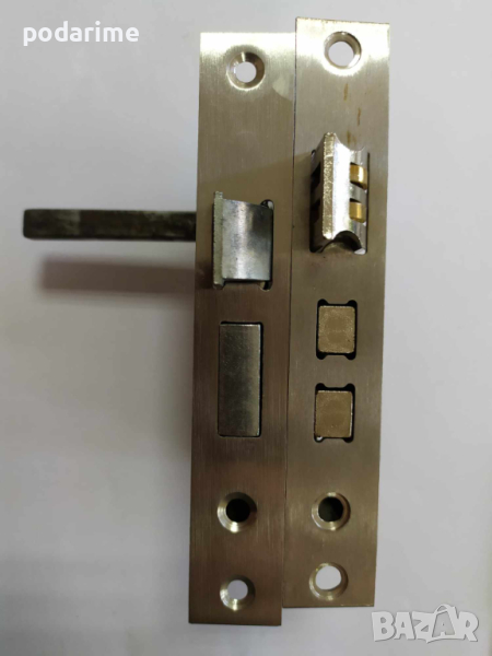 Брава за интериорна китайска врата, междуцентрие 50 мм, бексет 40 мм/ разстоянието от центъра на отвора за квадрата до челната планка/. Дължина на челната планка 124 мм, междуболтово на челната планка 111 мм. Височина на бравата 93 мм, дълбочина 60 мм. Бравата има два долни езика! Тя не е идентична с модел 1 /Брава за китайски интериорни врати 40/50 мм - модел 1/.