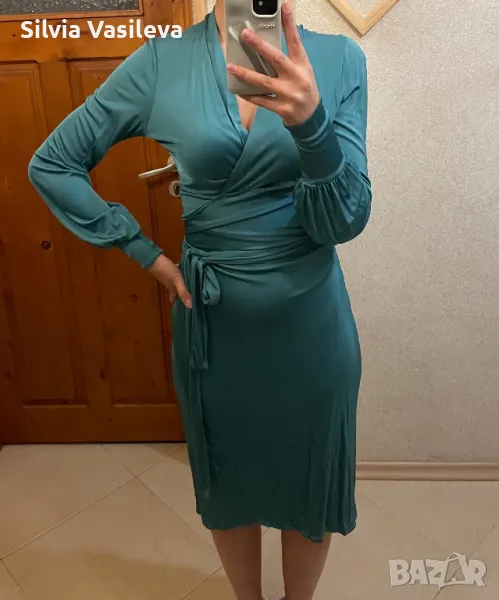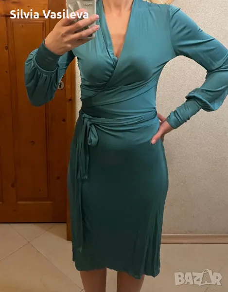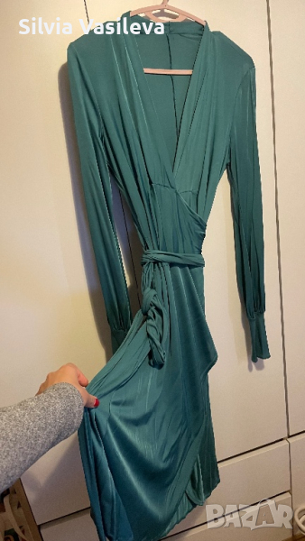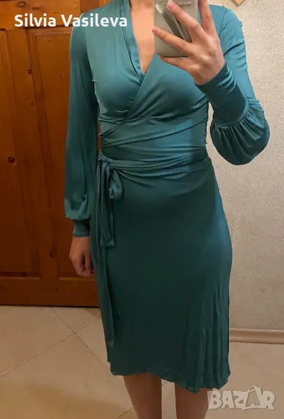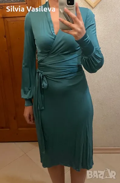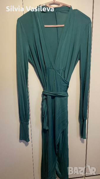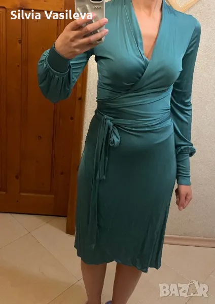 Зелена сатенена рокля с премятане и завръзване около кръста . Дълбоко V-образно деколте.