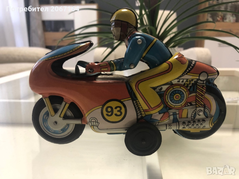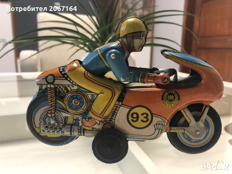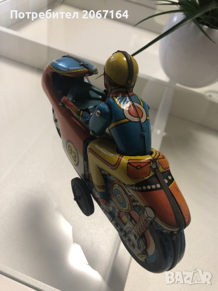 Голям ламаринен мотор в перфектно състояние!Механизма работи ,при бутане издава звук и моториста се навежда и изправя!Имам и доста други ламаринени играчки.