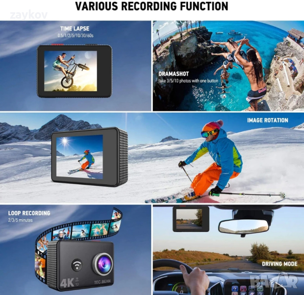 TEC.BEAN T2 4K Екшън камера Ultra HD 4K видеозапис. Можете да заснемате зашеметяващо 4K 25fps/1080P 60fps видео TEC.BEAN HD action camera е идеален цифров фотоапарат за ежедневна употреба или пътуване. Когато карате сърф, гмуркане, гмуркане с шнорхел, колоездене или шофиране. Монтирайте го на колата, когато шофирате по живописен път и запишете вашето приключение! Той е с идеални размери, както преносим, така и монтируем. Това е екшън камера за спортни фенове или всеки, който иска да запише зашеметяващи кадри. Всеки може да използва 4K видеокамерата, за да заснеме видео и да сподели забавлението със семейството и приятелите си. WiFi функция и 2.4G дистанционно Позволява ви да заснемате сами по по-удобен начин. Никога не е било по-лесно да споделиш историята си със света. 1. 4K/25pfs резолюция 2. 2" TFT екран 3. 2.4G RF дистанционно управление