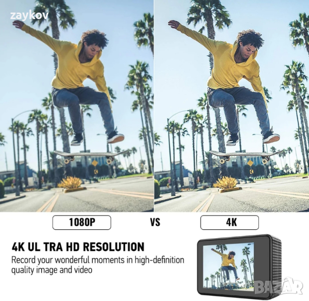 Позволява ви да се самозаснемате по по-удобен начин. Удобно контролирайте вашата спортна камера 4K дистанционно. Стартирайте и спирайте запис или правете снимка с едно натискане на бутон. 2.4GHz Защитен от пръски /Разстояние 10m.