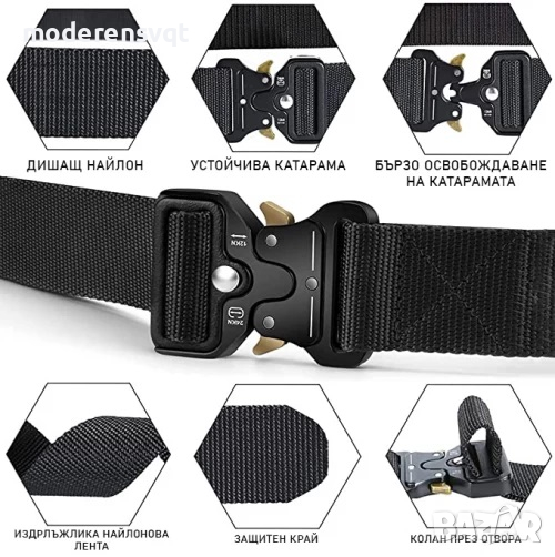 Притежава висококачествена изработка от ремък със здрави шевове, което гарантира висока устойчивост. Много издръжлив този тактически колан е перфектен за военни и униформени служби, както и за военни, ловци и туристи. Перфектен за всякакъв вид панталон за всякакви пътувания и къмпинг. Коланът може лесно да се зареди с аксесоари, напр.