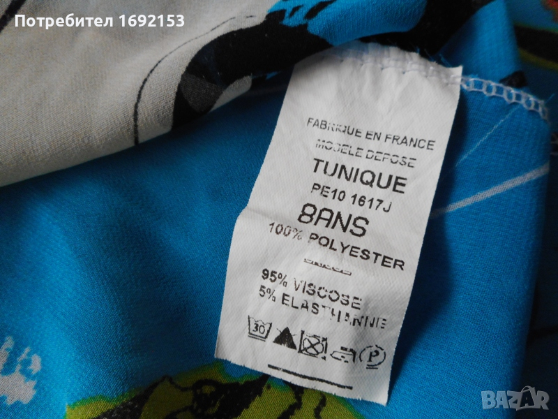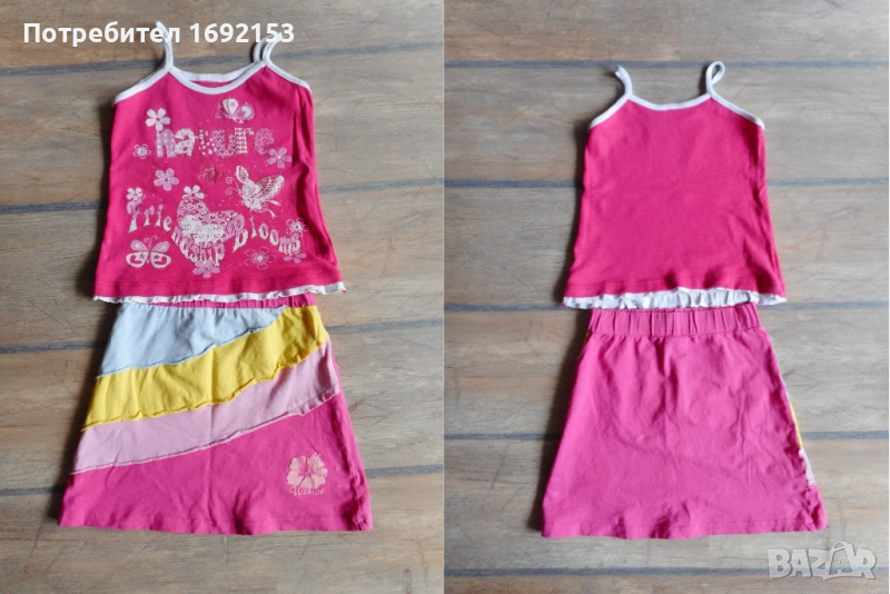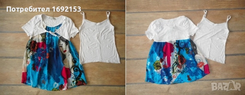 - К-т туника с меко трикотажно деколте и коприна + потник с тънки презрамки за възраст 8год. С декоративни връзки отпред. Стои свободно и много красиво. Дължина 58см. Материята на потника и горната бяла част на туниката е 95% вискоза и 5% еластан, а на синята долна част 100% полиестер. Туниката беше любима и е поносена, но е изключително качествена дреха и е в перфектно състояние.